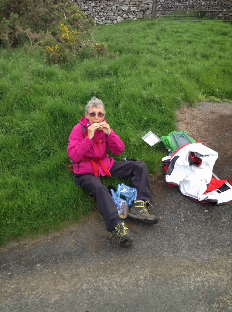 We tried to start out early and not wake up Jean; but, she would not have it. What a kind woman. She made us lunches to bring on the trail. They consisted of a sandwich, orange juice, banana, potato chips, cake and candy. Enough food for two days and she wouldn't let us pay for it. It is no surprise that she rescues dogs and cats. The Manor House is a lovely place and very comfortable. The start was the easiest so far. We crossed the bridge and turned right on a paved path that had a finger post. Assisted by a compass, most of the trail was well marked. We walked up to the Nine Standards, which refers to nine rock pillars or cones. They are in the Pennines a little over 2000 feet. It then began to rain, not hard but consistent. The track was through bog county. Watching carefully your next step, often failures found your boot submersed in Peet goo. There is a lot of erosion so the park has three routes depending on the time of year. We did the Red route because it was May to July. We eventually descended into the valley which is beautiful and green. It is hard to believe that this is an area full of lead mines. The lead was first mined by the Romans and perhaps before them by Bronze Age man. At one point there were over 40 smelt mills. Today all you see is sheep. On reaching Keld we found our accommodations at the Butt House where we were greeted warmly by Jacqui. For dinner Chris served one sumptuous three course meal. The accommodations included a bath tub with very hot water were just what the body needs after a slog through the bog.